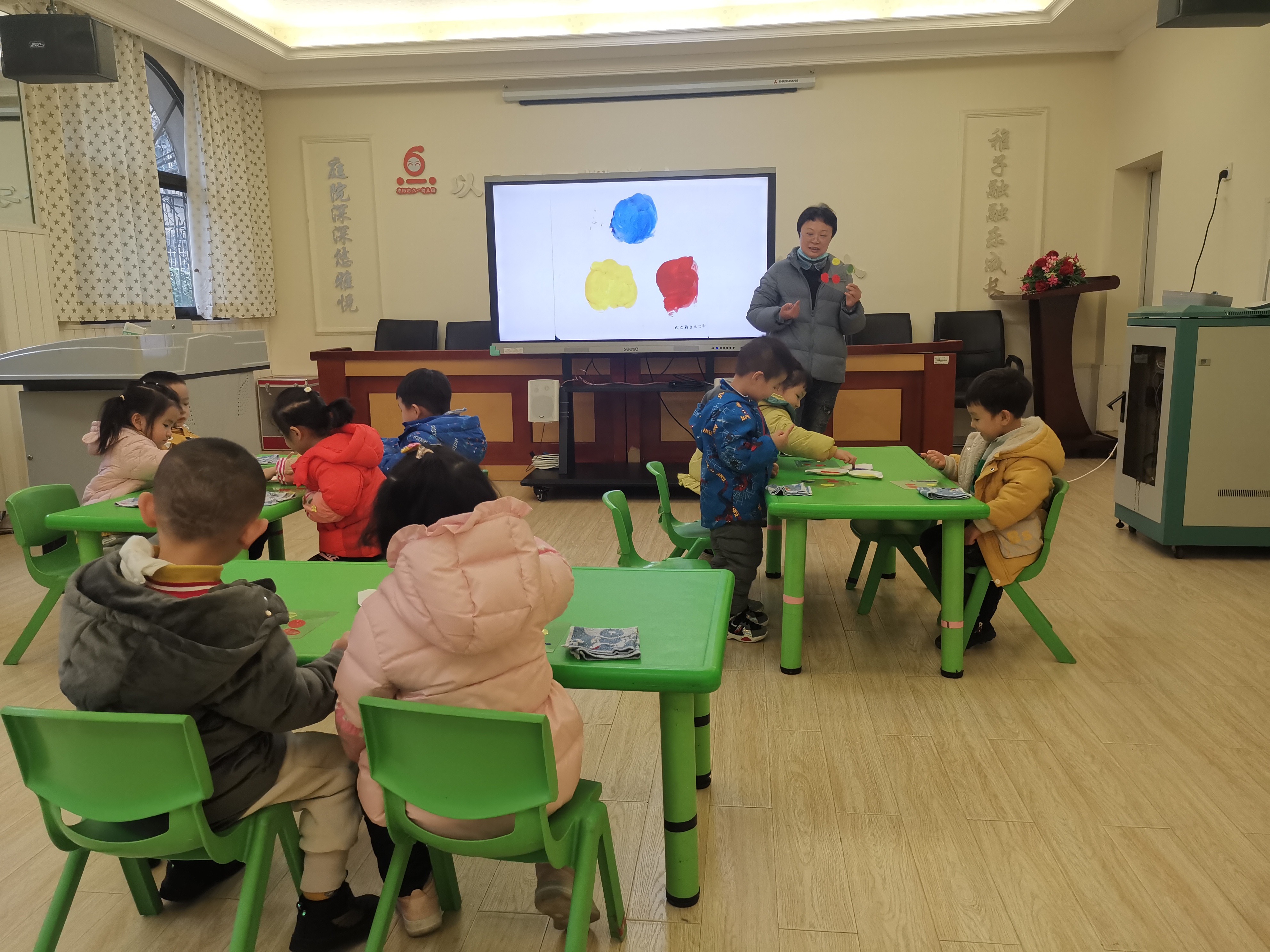 孙老师首先播放课件激发幼儿的兴趣,引入主题;其次播放课件的第二页至第九页让幼儿认识红黄蓝三原色。再次,让幼儿感受两种颜色混合变出新颜色,幼儿通过沾、涂、抹等动作尝试颜色的不同变化。最后,师幼共同欣赏作品,分享自己的经验。接下来,观摩中二班班级环境创设,翁雯老师通过PPT展示并讲解了中二班班级环境创设的意图和创作的过程。