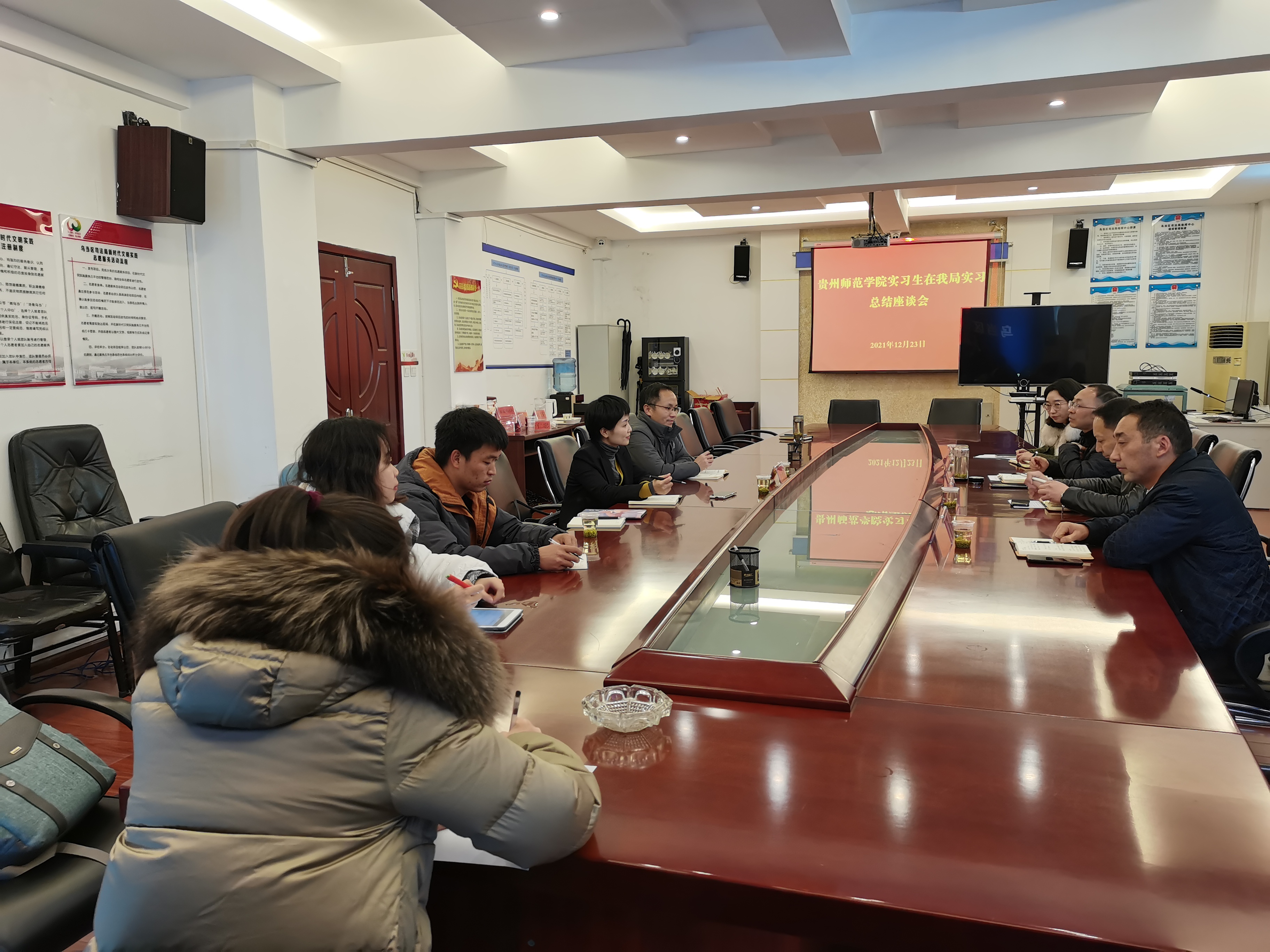 12月23日下午,乌当区司法局与我校教育科学学院召开实习生实习总结座谈会,乌当区司法局局长杨代义、副局长郭昶、办公室主任向鸿、高新司法所所长刘胜鸿、新天司法所所长姚耀正,我校教育科学学院副院长黎平辉、指导教师骆婧以及2018级应用心理学专业3名实习生参加总结座谈会,会议由司法局局长杨代义主持。