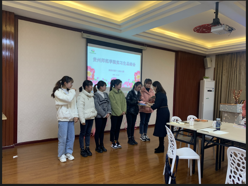 2021年12月24日下午,贵州royal皇家88平台2018级学前教育专业6名学生实习总结会在贵阳市第十三幼儿园会议室召开,贵州royal皇家88平台副院长黎平辉教授、李健年老师、实习单位学院负责老师陈泽婧及贵阳市第十三幼儿园园长杨睿、副园长张玉敏、保教主任李忻露、办公室主任孙宗梅、幼儿园实习指导教师等一同参加此次实习工作总结会。