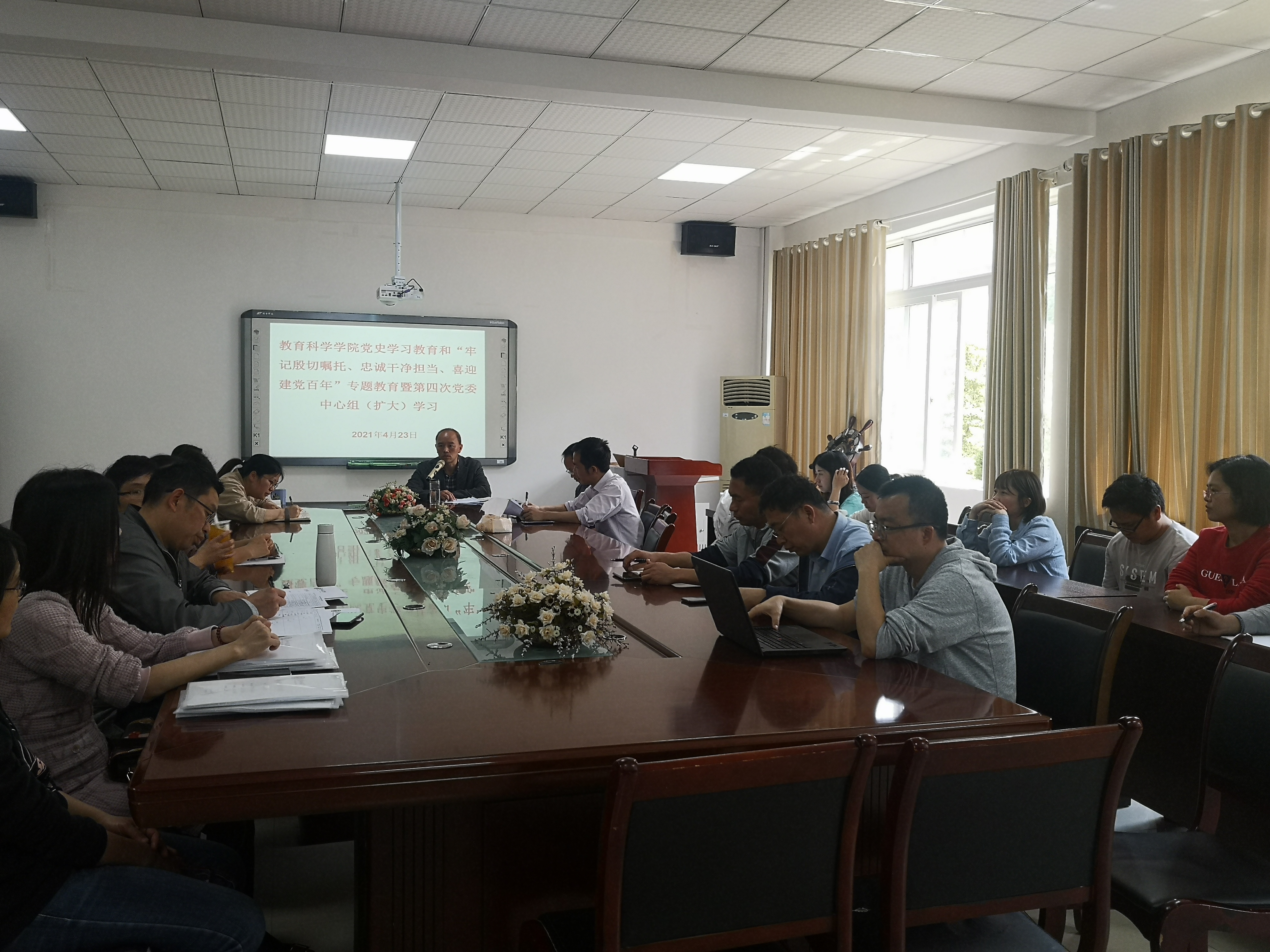 2021年4月23日中午,教育科学学院在逸夫楼学院会议室,举行党史学习教育和“牢记殷切嘱托、忠诚干净担当、喜迎建党百年”专题教育暨第四次党委中心组(扩大)学习,学院党委书记彭祥友主持学习,学院党委中心组成员,全体教师党员参加。