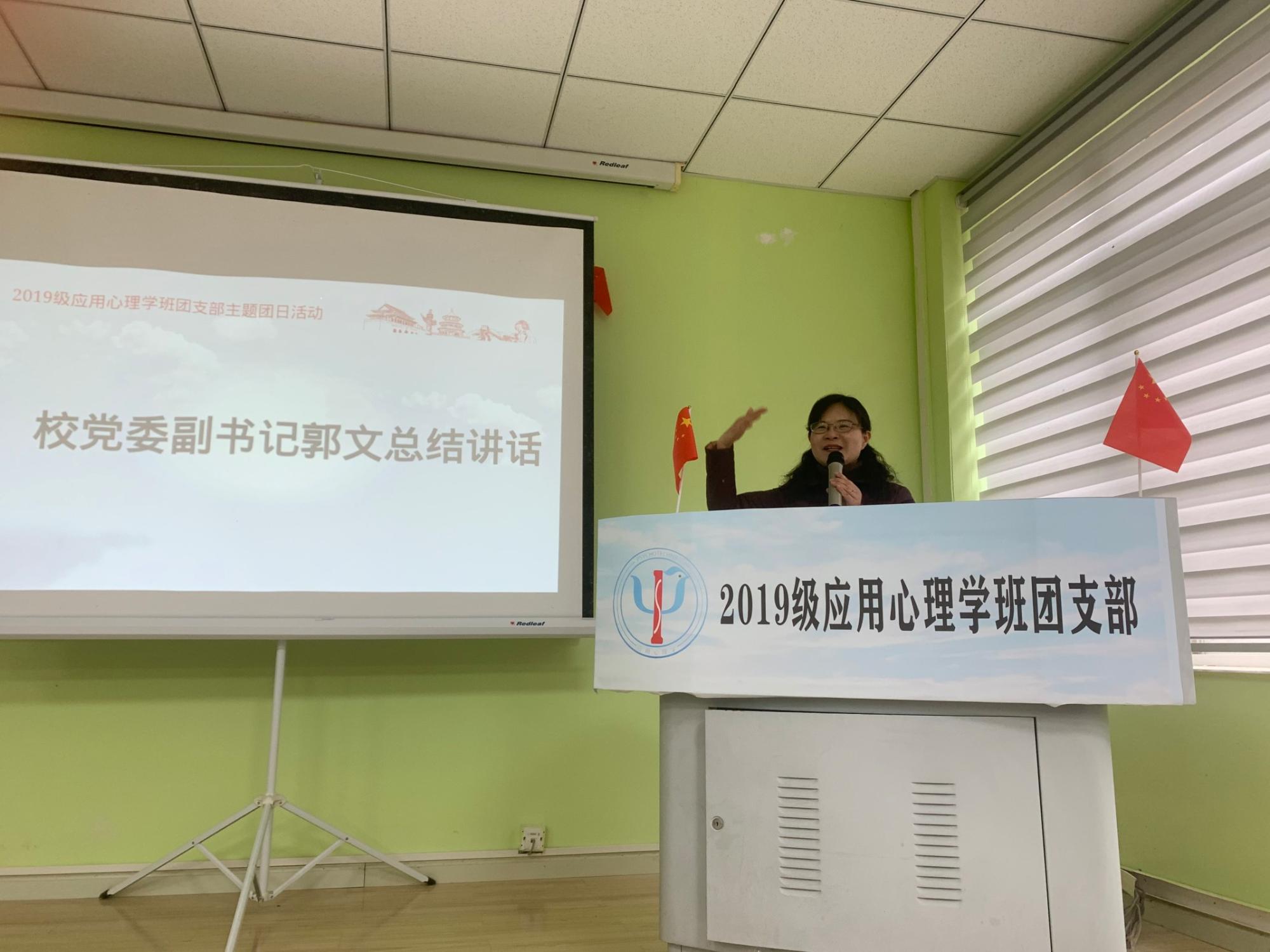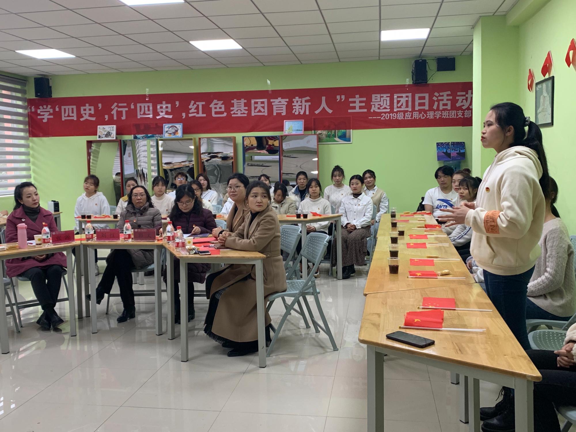 为深入贯彻落实习近平总书记关于学习党史、新中国史、改革开放史、社会主义发展史的重要指示精神,引导广大团员青年树立崇高理想,增强团员青年的使命意识。2020年12月4日上午,教育科学学院2019级应用心理学班团支部在逸夫楼215教室开展了关于“学‘四史’,行‘四史’,红色基因育新人”的主题团日活动。我校党委副书记郭文、教育科学学院院长刘红、党委副书记傅小芳、团委书记张源、辅导员鲁蓓蓓老师出席了此次活动,2019级应用心理学班团支部全体团员参加了此次活动。活动由团支部成员赵洪洪和刘蓉蓉两名同学主持。