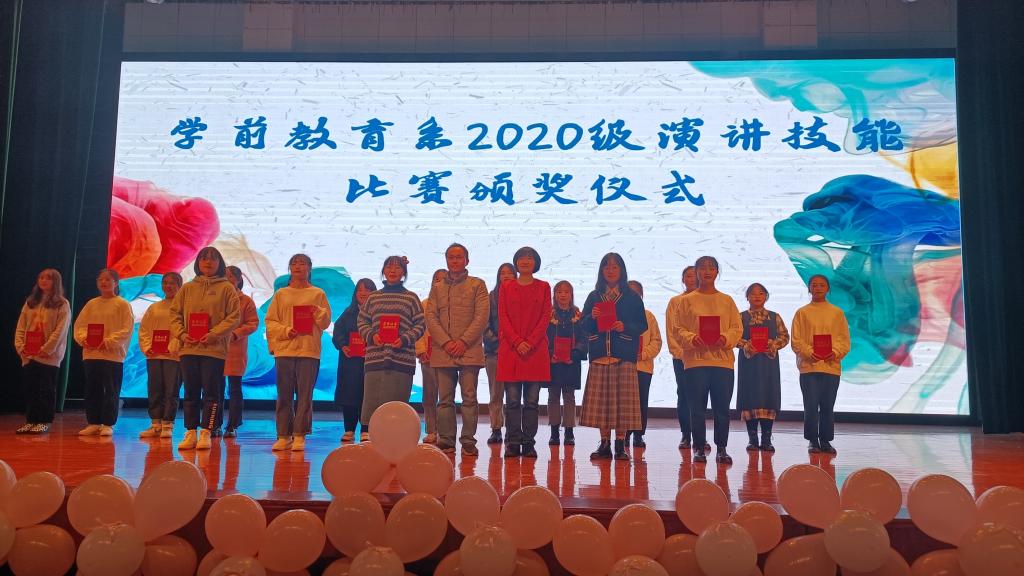 为适应新形势下的教学改革,加强我学生的基本功训练,提升教学技能,我系特举办学生技能大赛。2020年12月14日星期一18:00学前教育系届技能大赛颁奖典礼在逸夫楼演播隆重举行,学前教育系全体师生以及院领导均到场参加
