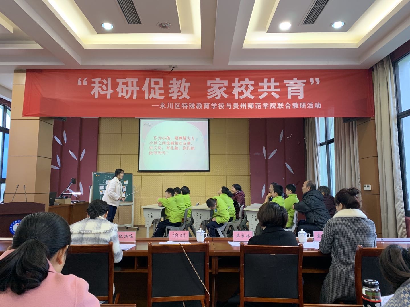 2019年12月13日,为促进高校理论与一线特殊教育学校实践更好的结合,做到优势互补,协同发展,贵州royal皇家88平台特殊教育系与重庆市永川区特殊教育学校举办联合教研活动,特殊教育系主任杨娟前往参加。