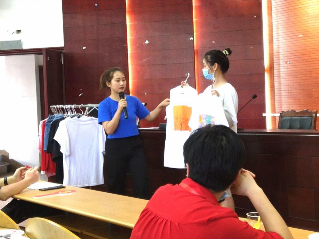 参赛选手来自各个学院,这是我校第一届带货王比赛,目的是选出优秀选手为我校的定点扶贫地——铜仁印江网络售卖农产品。各个参赛选手准备充分、大方得体,颇有带货主播的气势,我院王春燕同学更是在得到比赛通知的第一时间就与张源老师商讨比赛方案,确定好方向后马上行动,将特殊儿童和留守儿童的绘画作品做成了爱心T恤,希望能够宣传本院的学科特色和以学科特色为支撑所做的公益活动。备赛期间,张源老师给予多方面的支持,一起反复敲定比赛方案,这个出发点和王春燕同学的表现力得到了各位评委老师的一致好评和现场观众的竞相竞拍,最终以最高分斩获一等奖。