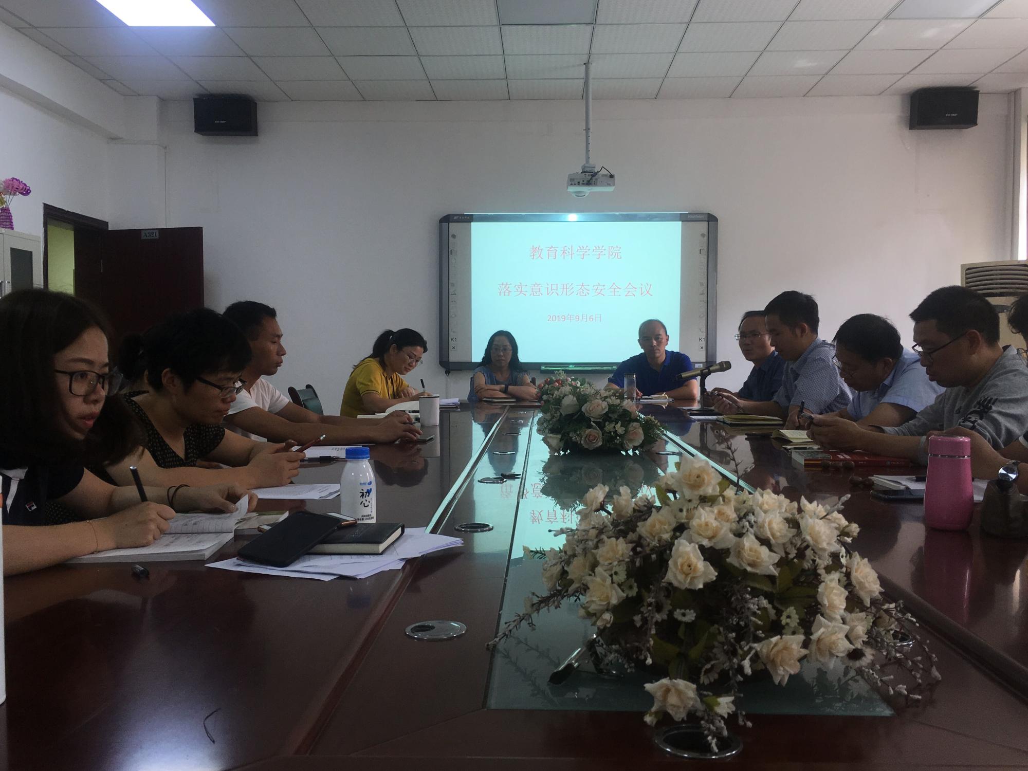 9月6日,教育科学学院在逸夫楼3楼会议室召开落实意识形态安全会议。全院教师到场参加,会议由院长刘红主持。
