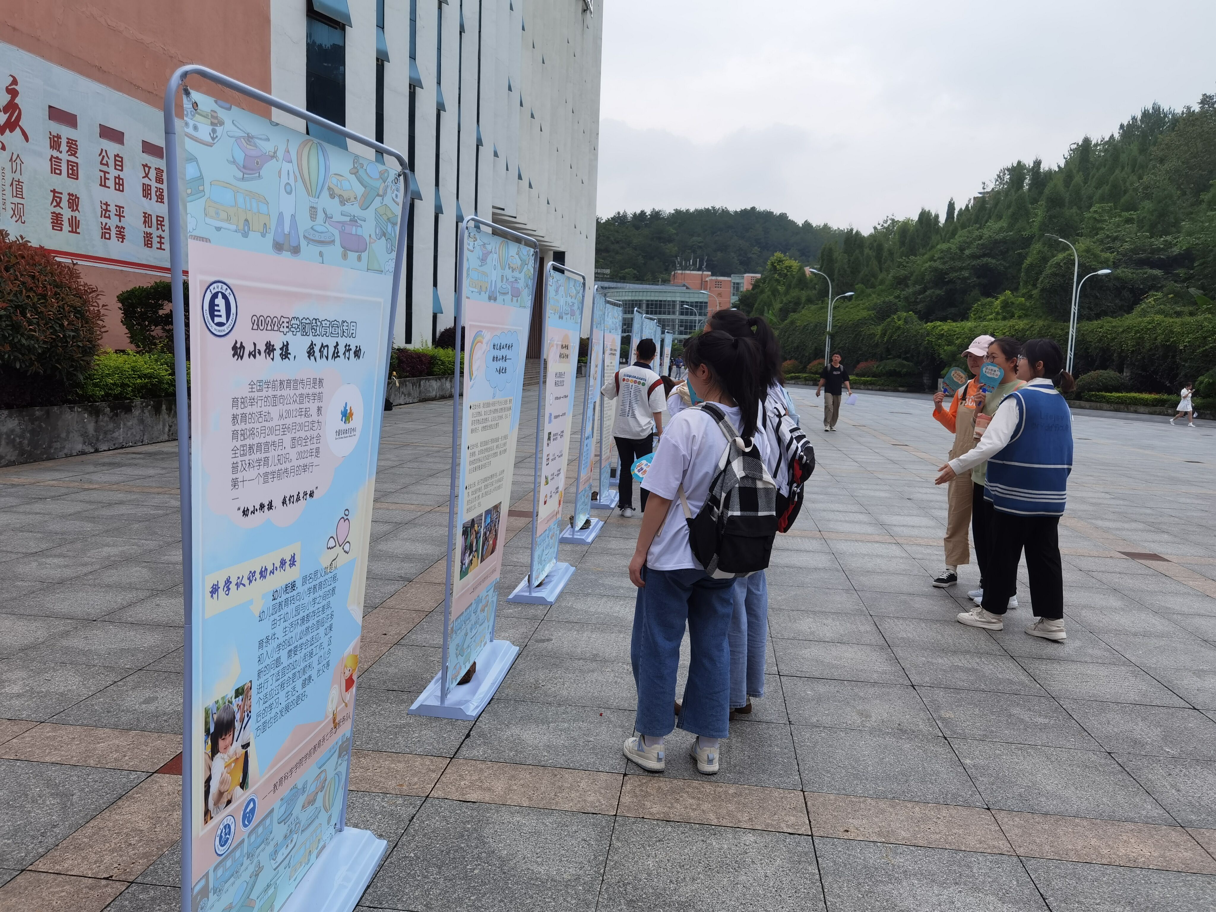 首先于贵州师范学院凤凰广场用易拉宝展架展示宣传幼小衔接的含义、“教育部关于大力推进幼儿园与小学科学衔接的指导意见”等内容,展示过程中七色光服务队为前来观看的学生进行讲解。