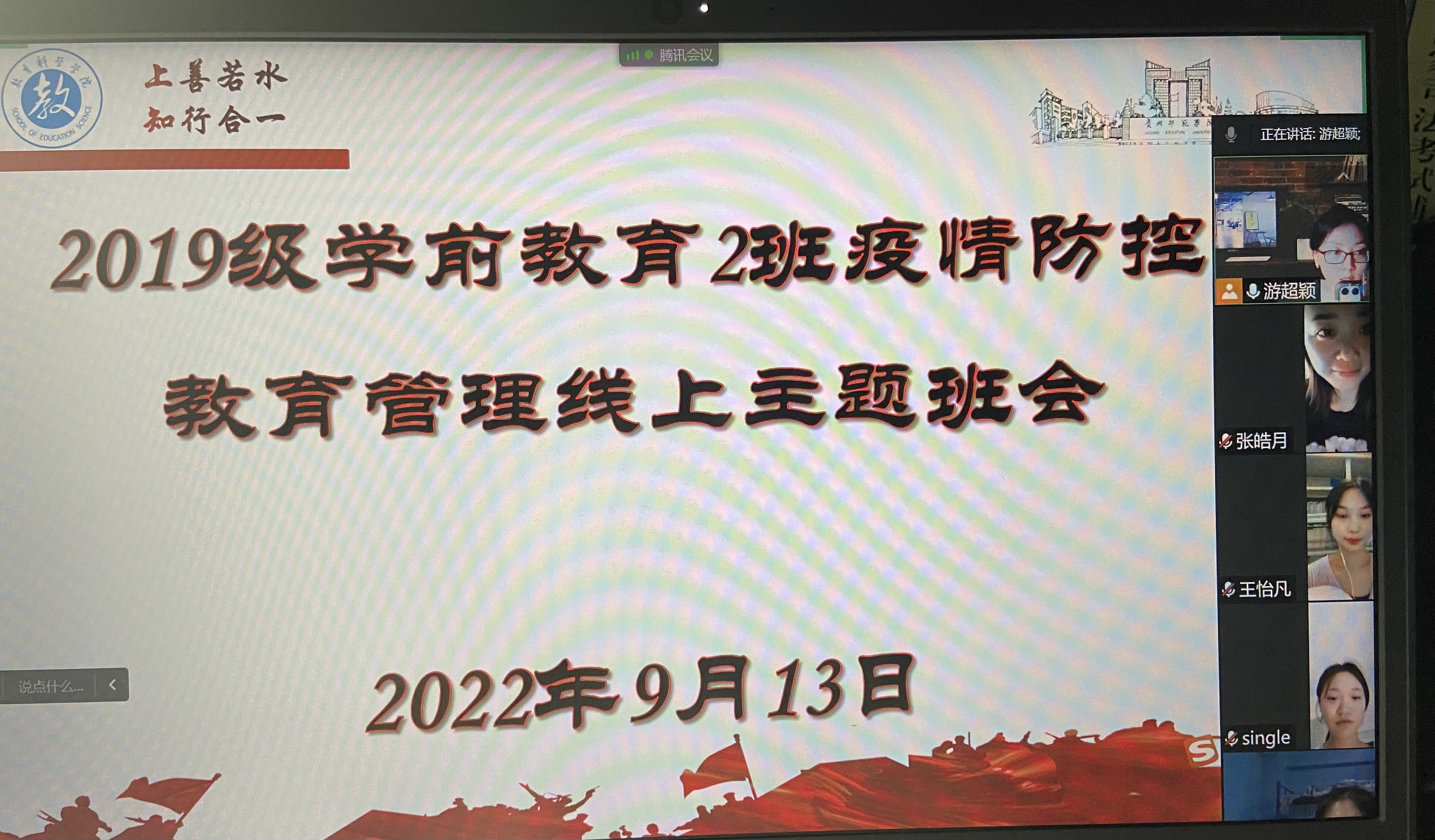 根据学工部《关于召开疫情防控期间学生教育管理网络视频主题班会的通知》要求,9月13日,教育科学学院2019级学前教育2班在线上召开疫情防控教育管理主题班会。全班同学参加了会议,会议由辅导员游超颖主持。