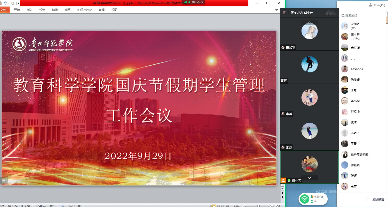 为了做好学生国庆节假期的疫情防控工作和学生管理工作,9月29日,教育科学学院在线上召开疫情防控期间国庆假期学生管理工作会议。学院党政主要领导、学院团委书记张源、全体专兼职辅导员及科研助理参加了此次会议。会议由傅小芳主持。