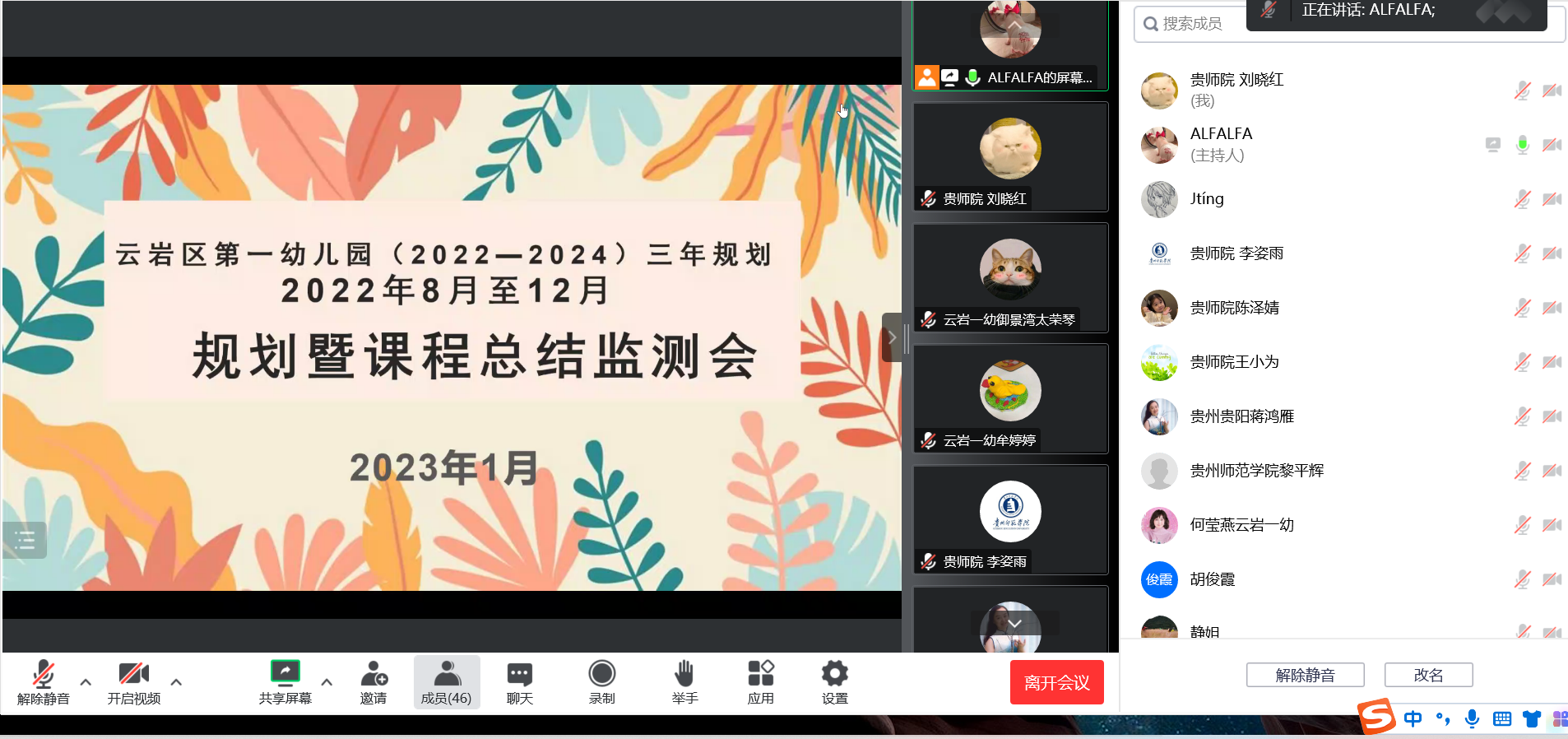 2023年1月12日下午,受云岩区第一幼儿园蒋鸿雁园长之邀,教育科学学院副院长黎平辉,学前教育系教师李建年、刘晓红、王小为、陈泽婧和李姿雨等参加了云岩一幼(2022-2024)三年规划2022年规划暨课程总结监测会(腾讯会议)。出席会议的还有原实验二幼园长黄保秀、副园长李士莹,中建设区居委会王芳书记、云岩一幼家委会代表以及园务会成员和各部门负责人。