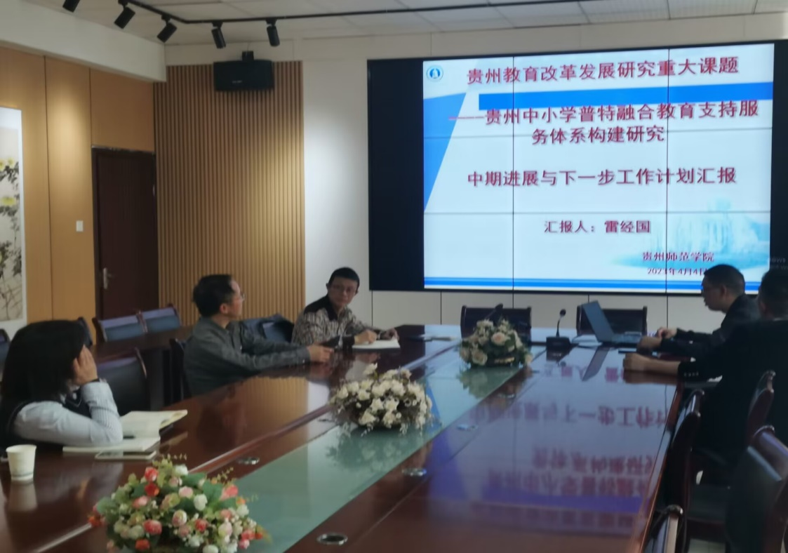 汇报会上,课题主研人雷经国副教授从课题研究进展的基本情况、应然与实然视角下贵州中小学普特融合教育支持服务体系的模型框架结构与要素、研究发现与结论,下一步研究工作计划等四方面做了全面汇报。各位专家认真听取课题的阶段性成果汇报后,对已有研究发现与结论进行了深入的研讨与指导,提出了宝贵的意见和建议。各位专家和教师一致认为,该课题开展已经取得了实质性的进展和较好的阶段性成果,建议下一阶段通过深度访谈和追踪调研等方式,进一步优化支持服务体系构建、明晰其体系的渐进式实施路径,做好后期结题资料的收集与分析等准备工作。