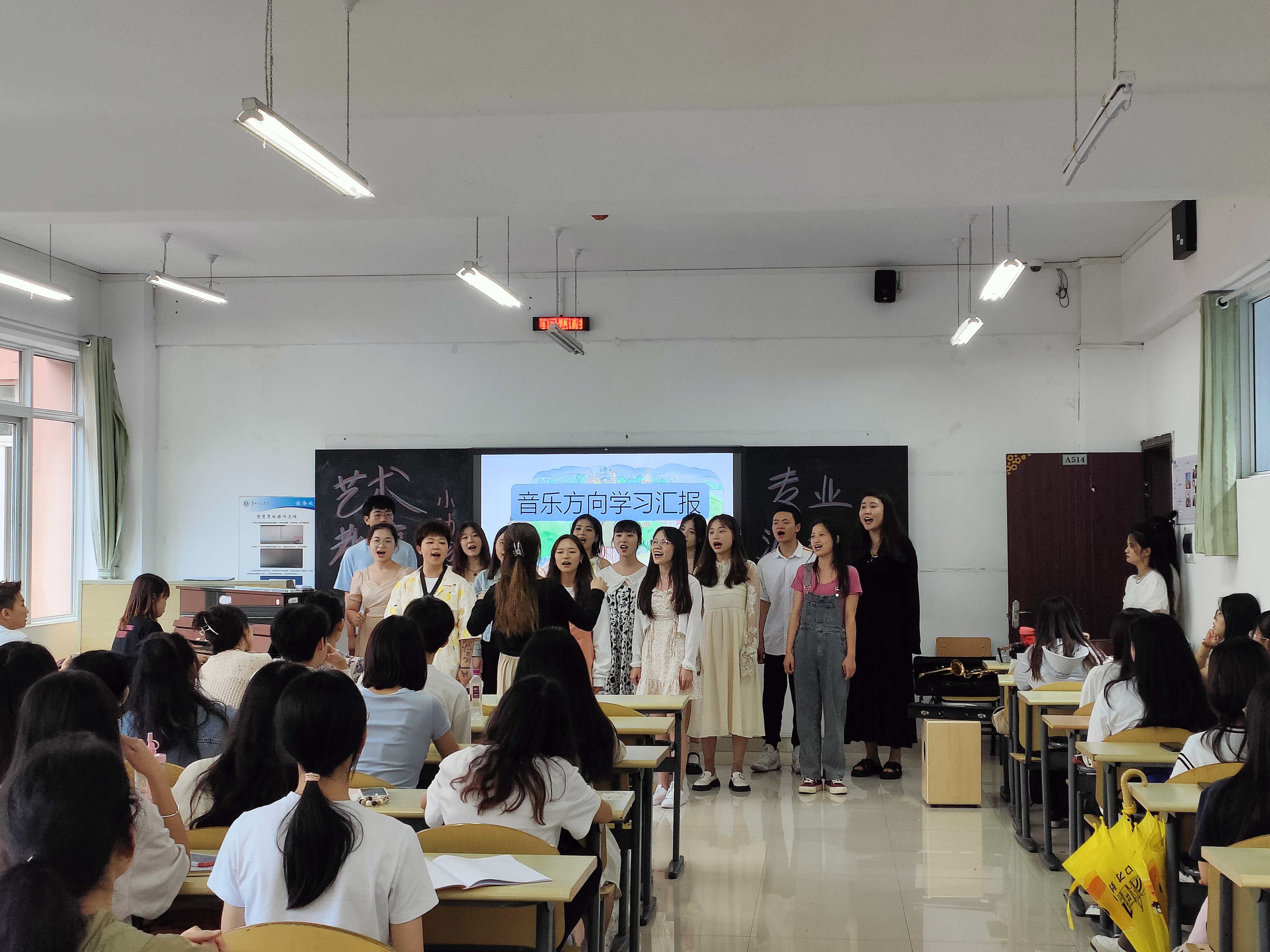 2023年6月26日13时,艺术教育系2020级、2021级、2022级全体同学在逸夫楼514教室开展本学期专业见习/研习与实习前培训任务汇报与观摩活动,系主任马慧慧和专任教师张怡进行了观看与指导。