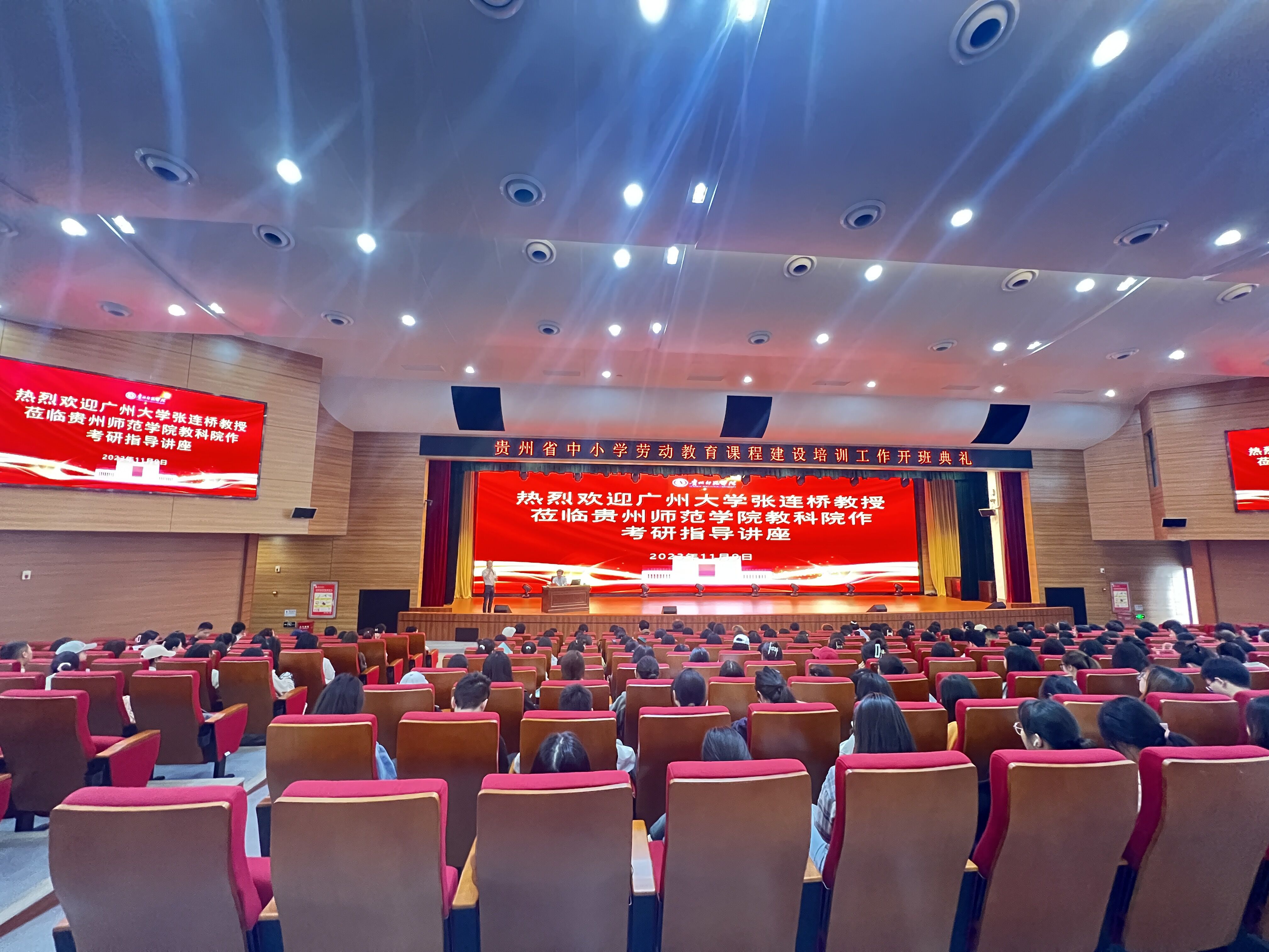 为增进2021级同学对所学专业考研状况的认识,解决同学们在考研择校、考研备考等方面的问题,使同学们知道考研意义,明确考研目标,坚定考研决心,2023年11月9日下午15:30,教育科学学院特邀请国内知名考研专家、广州大学张连桥教授做考研专题指导讲座。讲座在贵州师范学院综合楼报告厅举行,教育科学学院团委书记张源、辅导员张思远以及2021级全体学生参加,教育科学学院副院长黎平辉主持讲座。