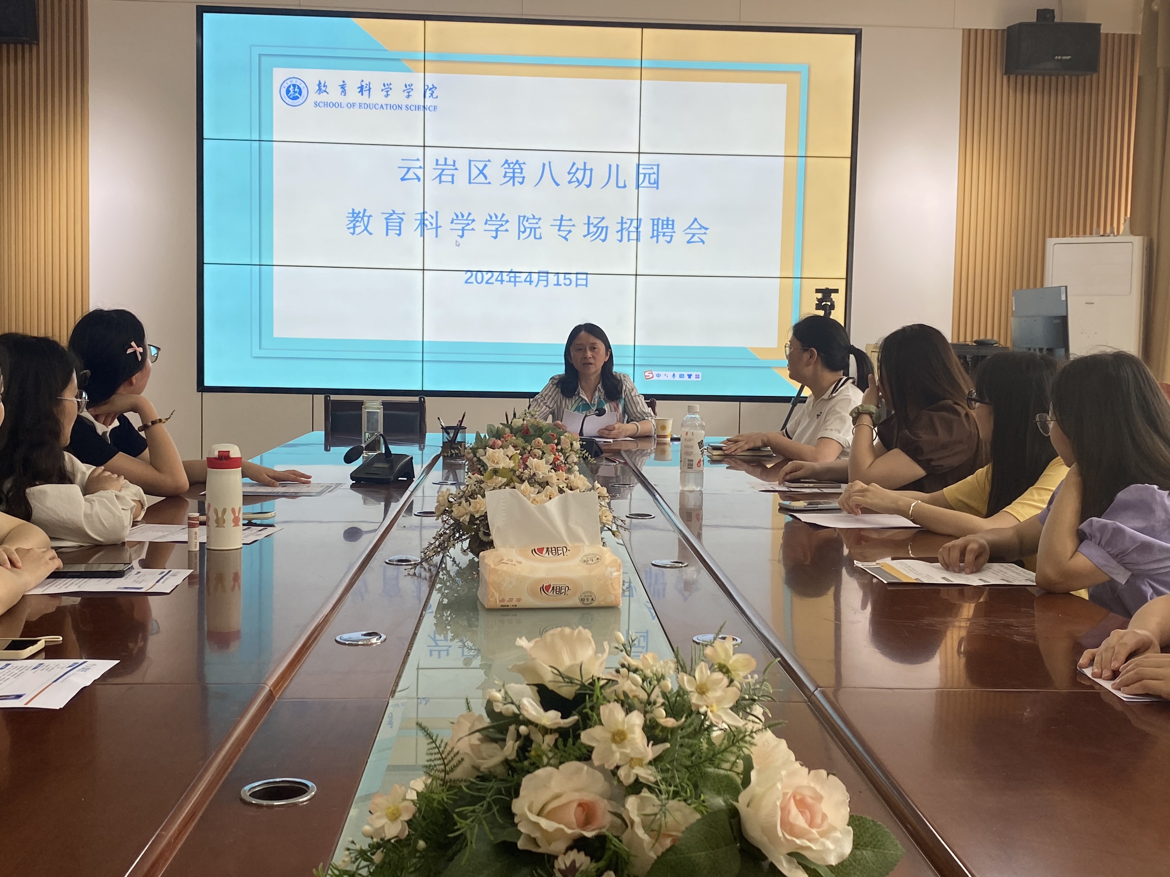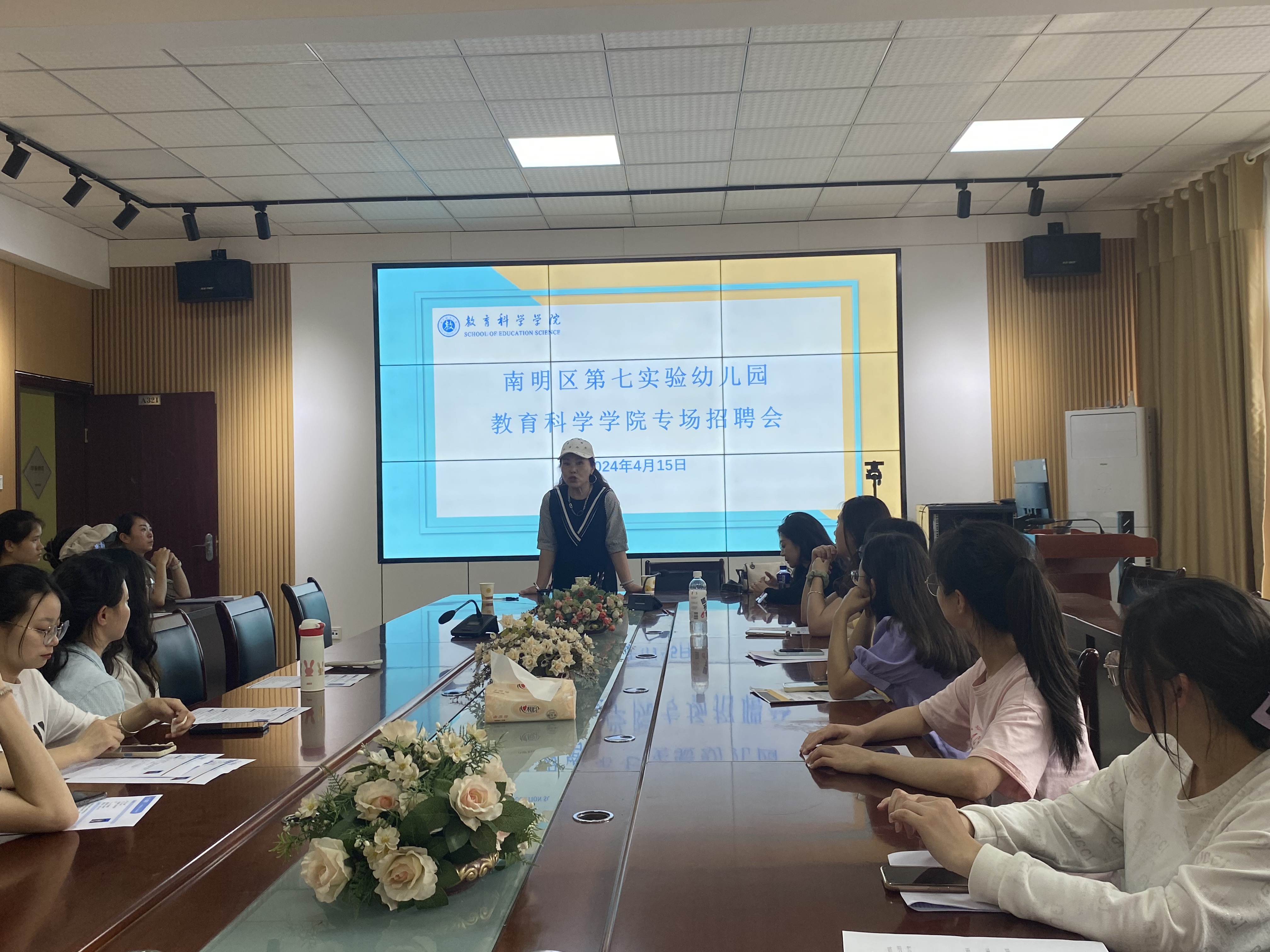 4月15日下午,教育科学学院在逸夫楼三楼会议室举办学前教育专场招聘会,云岩区第八幼儿园、南明区第七实验幼儿园、乌当区第四幼儿园等三家用人单位前来招聘。20级学前教育专业毕业生到场参加。