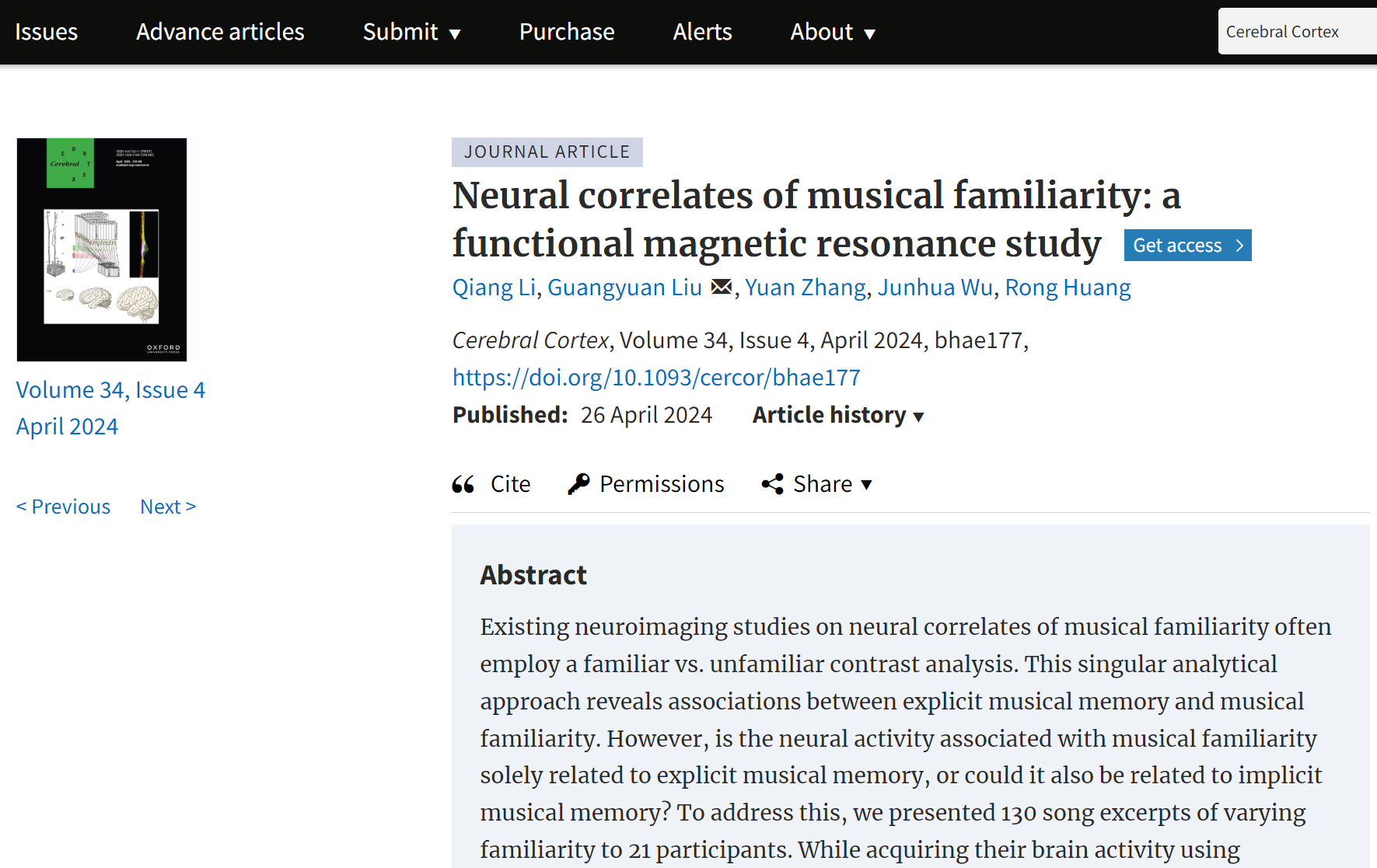 国际知名心理学和神经科学新闻网站PsyPost最近报道了贵州royal皇家88平台教师李强、张源、吴俊华、黄蓉以及西南大学刘光远教授在音乐的神经加工基础方向的一项重要研究。这项研究的论文标题为“Neural correlates of musical familiarity: a functional magnetic resonance study”,已发表在著名神经影像刊物《Cerebral Cortex》杂志上。