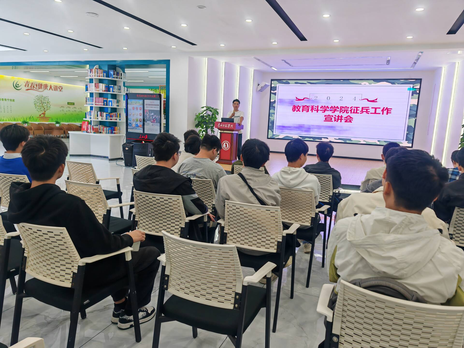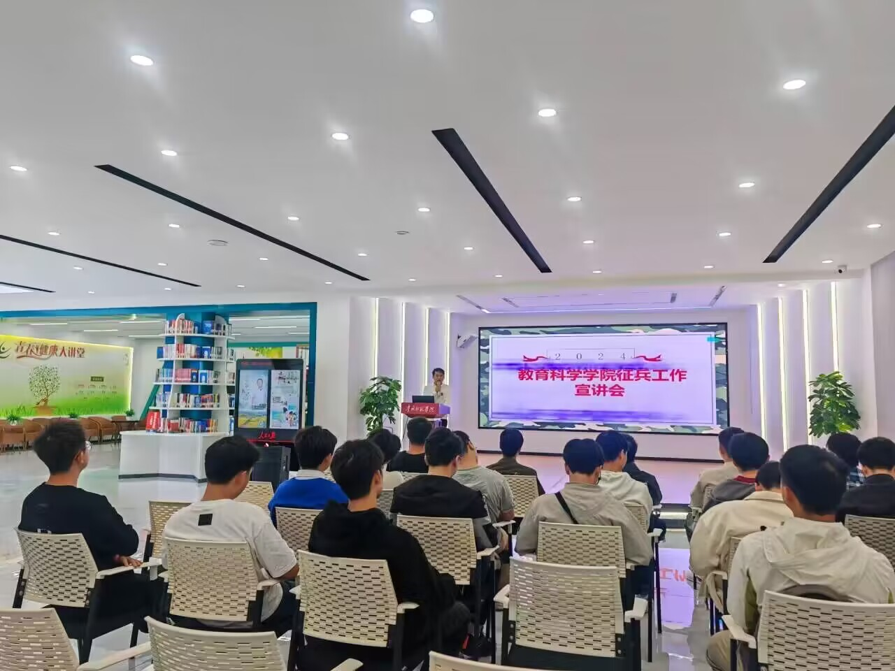 为响应国家号召,练就过硬本领,投身强国伟业,激发青年大学生参军报国的热情,2024年6月4日,教育科学学院在大学生事务中心开展了2024年征兵工作宣讲活动。学院党委副书记傅小芳、征兵工作负责老师鲁蓓蓓、2021级班级辅导员张思远及2021级全体男生参加了此次活动。