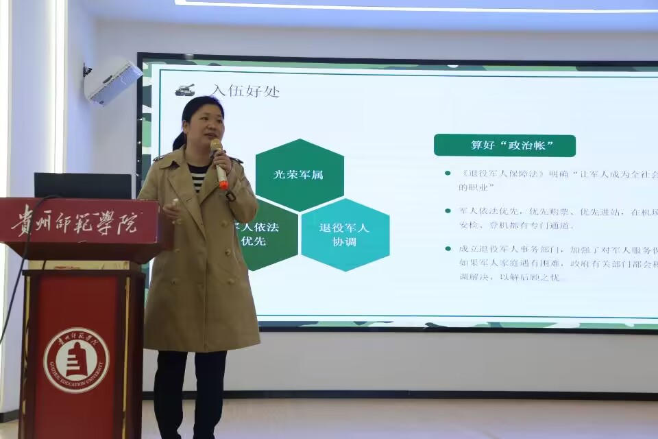 随后,傅小芳针对大多数同学比较关心的入伍政策、入伍补贴、入伍对个人的发展、入伍报名流程以及大学生参军学业优抚等内容进行了详细全面的宣讲。傅小芳希望大学生们深深地认识到参军入伍的重要意义,把个人理想融入强国梦、强军梦之中,积极投身军营,助力强军伟业,勇做走在时代前列的奋进者、开拓者、奉献者。她表示学院十分重视征兵入伍工作,学院全力为大学生应征入伍做好各项保障服务工作,做到组织到位、宣传到位和落实到位。