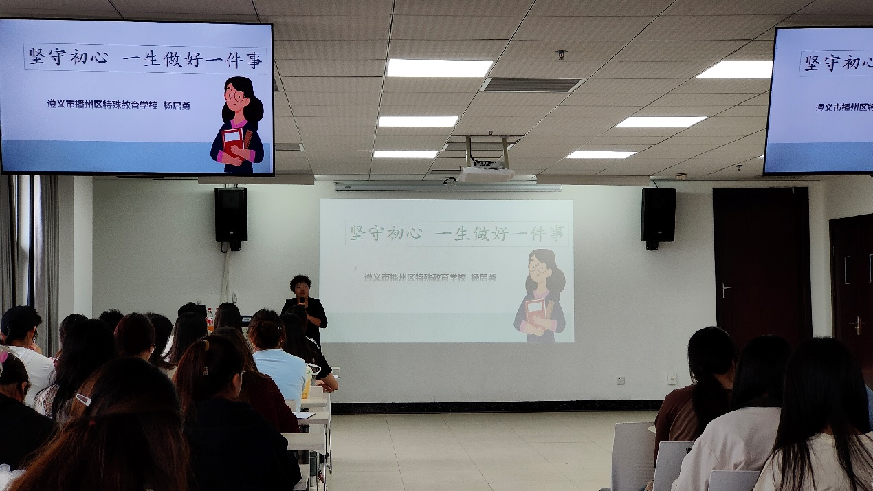 为进一步提高特殊教育系学生的教师需要的知识与实践技能,了解更多的特殊教育学校课程、教学、班级管理和教师的实践工作现状,2024年6月5日,特殊教育系邀请了播州区特殊教育学校校长杨启勇教师在宁静楼535为特殊教育系2023级、2022级、2021级特殊教育专业全体学生做了《坚守初心、一生做好一件事》的主题讲座。