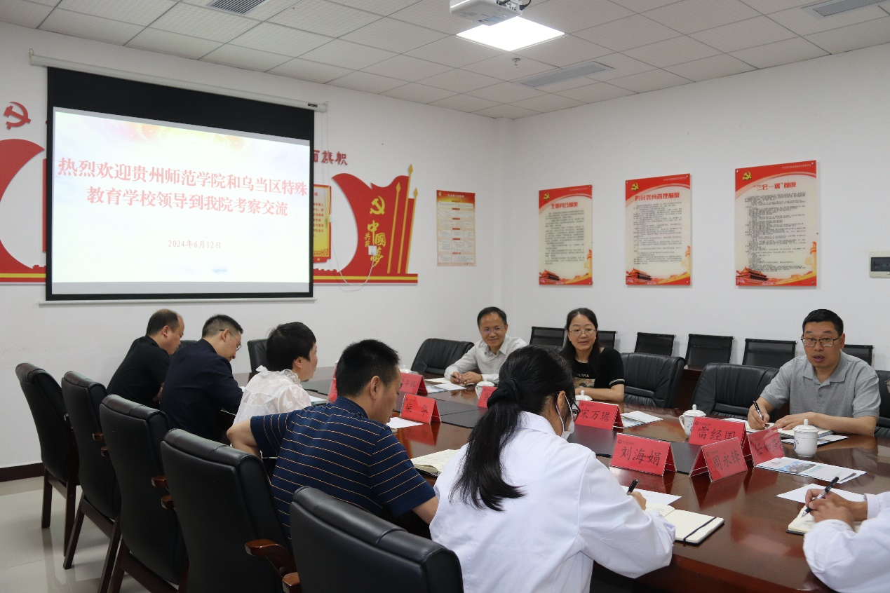 首先,贵州省康复医院柴华副院长对贵州师范学院教科院领导班子一行到访表示诚挚欢迎,并简单介绍了班子成员情况,然后详细介绍了贵州省康复医院成立、开业、发展历情况,科室建设、儿童康复特色、教科研等方面的情况。