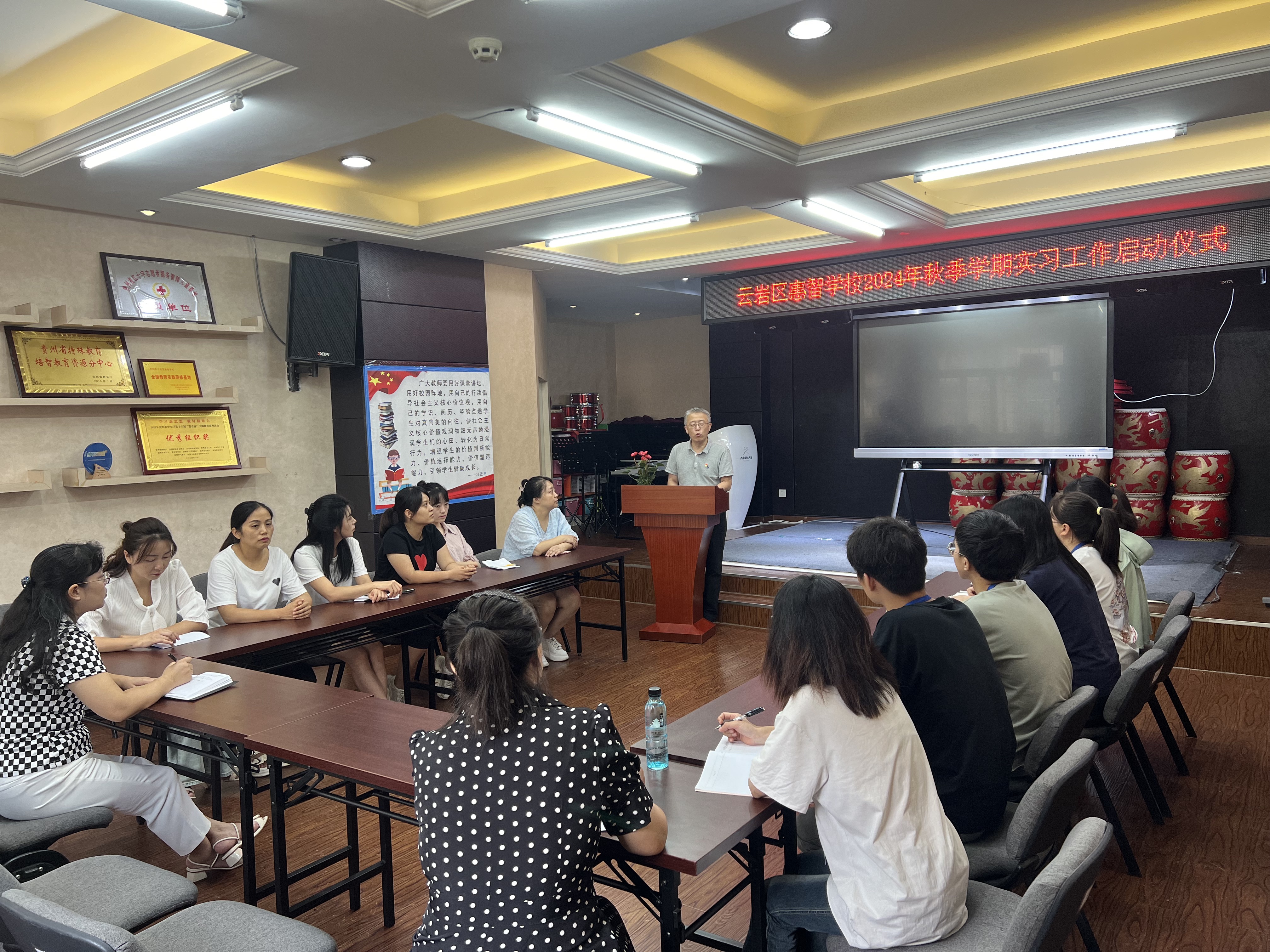 2024年9月2日,贵州royal皇家88平台夏卉芳教授带领6名2021级特殊教育专业实习生前往贵阳市云岩区惠智学校进行为期一个学期的实习。经过9天的适应性实习,2024年9月11日实习生正式进班实习,贵州royal皇家88平台与云岩区惠智学校联合召开2024年实习工作部署暨实习单位指导教师培训会,云岩区惠智学校梁波校长、黄礼琼副校长、赵校瑛主任和6名指导老师,以及贵州royal皇家88平台夏卉芳教授和6名2021级特殊教育实习生参加本次会议。本次活动由赵校瑛主任主持。