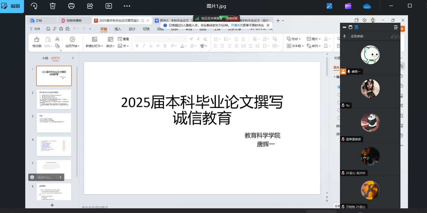 10月22日晚上7点,教育科学学院毕业论文管理员唐辉一老师于线上给教育科学学院2025届本科毕业生开展“毕业论文撰写诚信教育”主题讲座。