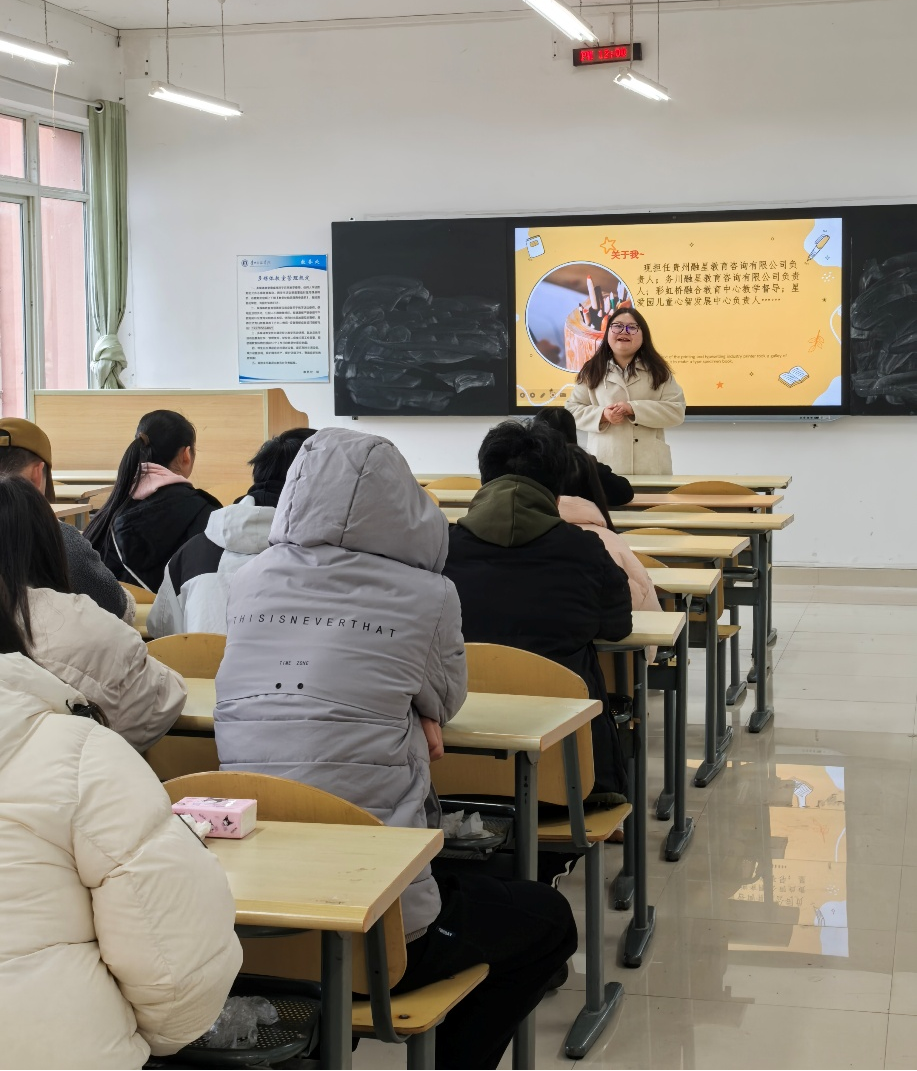 贵州融星教育咨询有限公司负责人李玉玲是我院2021届优秀毕业生,招聘会上,李玉玲详细介绍了机构的教学情况、发展规划和薪资待遇,并结合自身的发展历程与同学们分享了就业心得,动员同学们做好人生规划,在工作中丰富和完善自己,敢想敢做,不断学习和挑战自己。