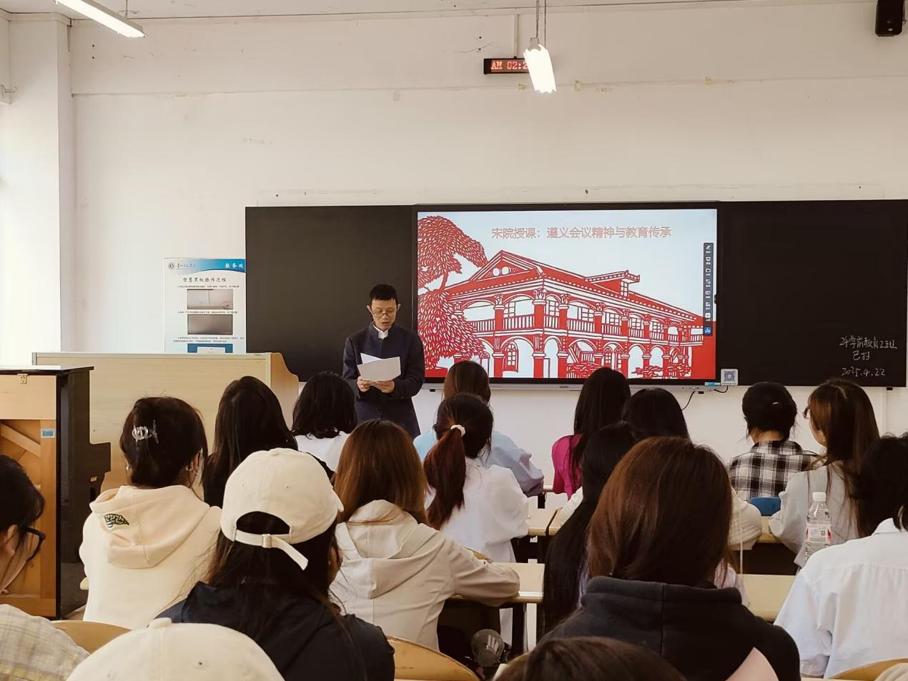 为纪念遵义会议召开90周年暨习近平总书记“运用好遵义会议历史经验,让遵义会议精神永放光芒”重要指示10周年,全面贯彻党的二十大、二十届三中全会精神,教育科学学院积极探索创新,将遵义会议精神深度融入青年学子思想教育。2025年4月25日,学院院长宋万琚走进2023级特殊教育班级,在逸夫楼514进行了一场别开生面的“纪念遵义会议90周年”主题班会活动。2023级特殊教育班辅导员鲁蓓蓓以及2023级特殊教育专业全体同学齐聚一堂,共同探寻红色精神与特殊教育使命的紧密联系。