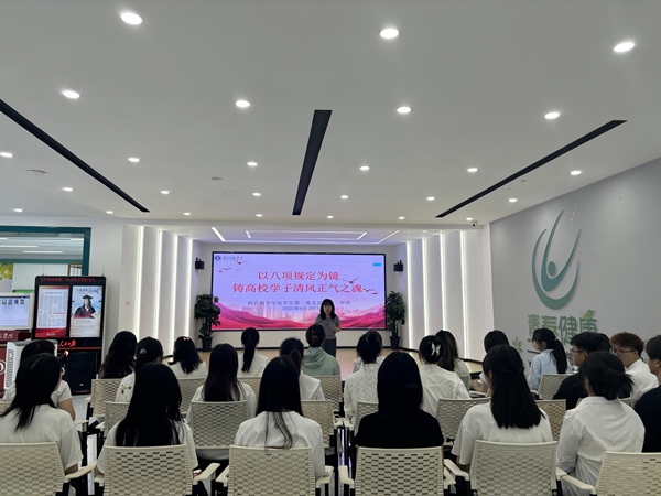 6月20日,教育科学学院学生第一党支部书记申苒在我校大学生事务中心为支部全体党员讲授了题为《以八项规定为镜 铸高校学子清风正气之魂》的学习贯彻中央八项规定的专题党课。旨在引导学生党员深刻把握中央八项规定精神的时代内涵,强化纪律规矩意识,为涵养风清气正的校园政治生态注入新动能。