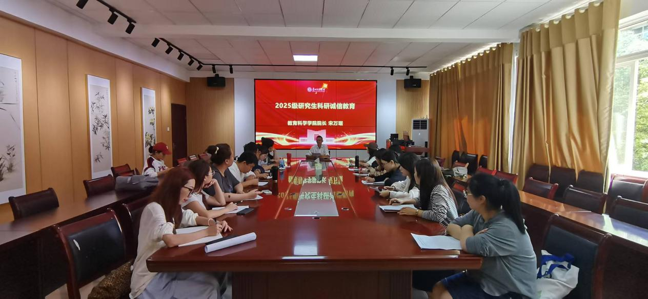 为引导新生恪守学术道德、规划学术生涯,9月24日下午,教育科学学院在会议室举行了2025级硕士研究生科研诚信教育暨入学教育(职业生涯规划)大会。学院院长宋万琚教授、2025级硕士研究生班主任鲁蓓蓓及全体2025级硕士研究生共同与会。