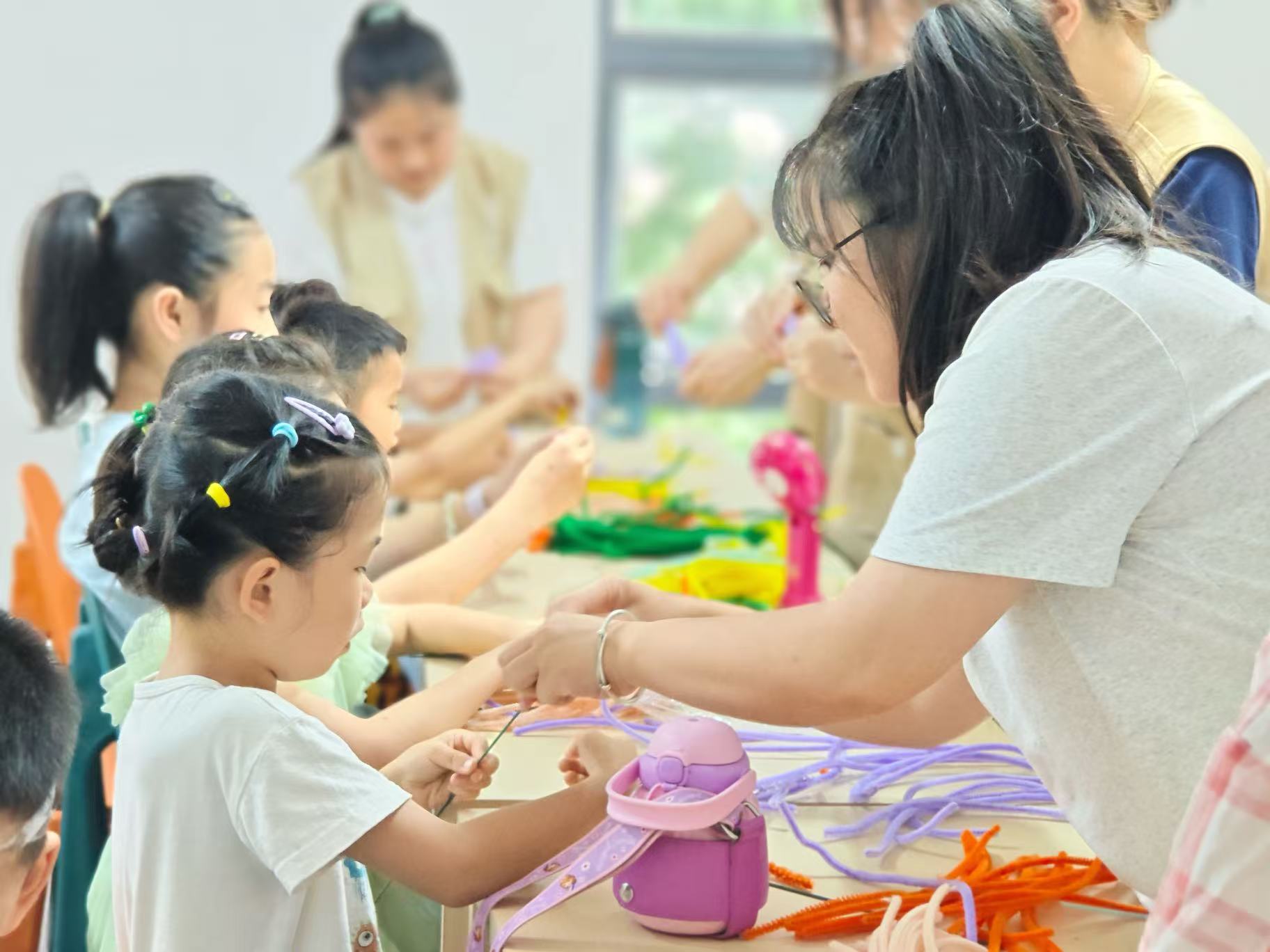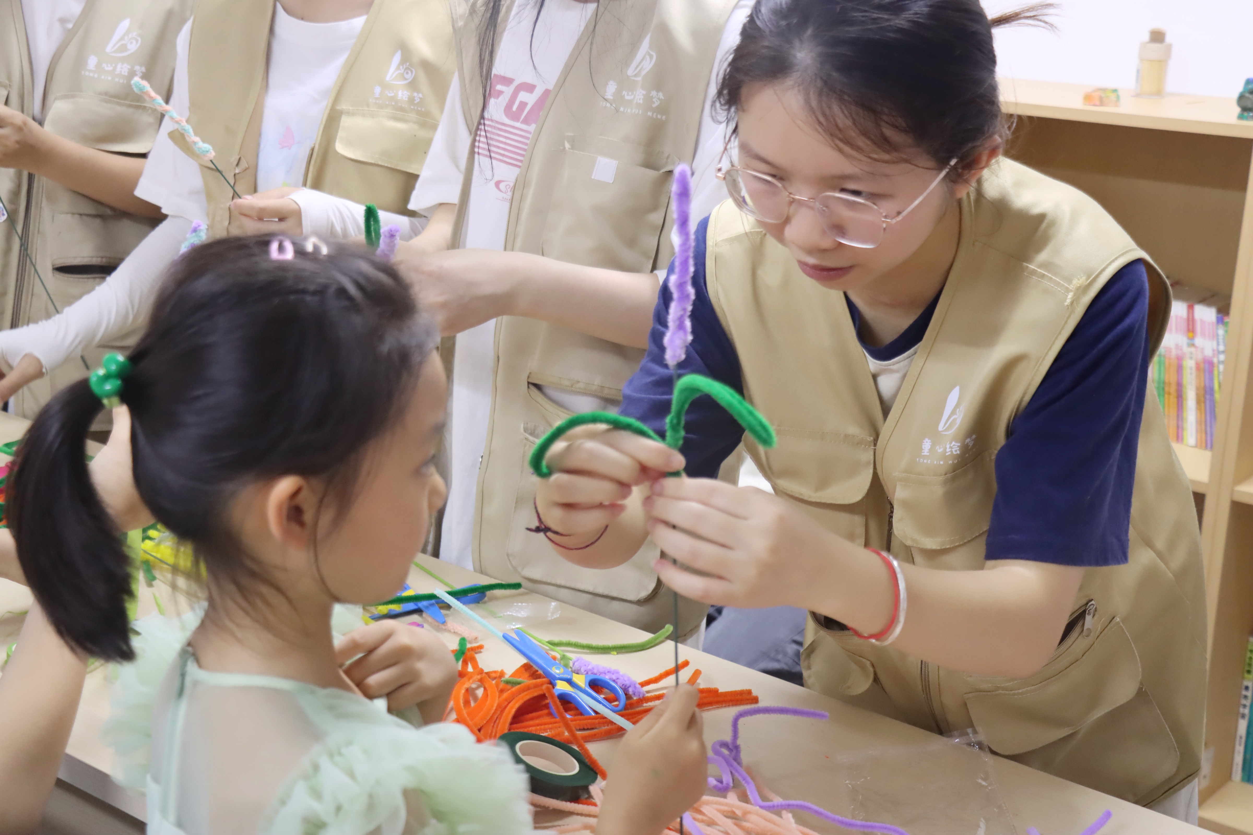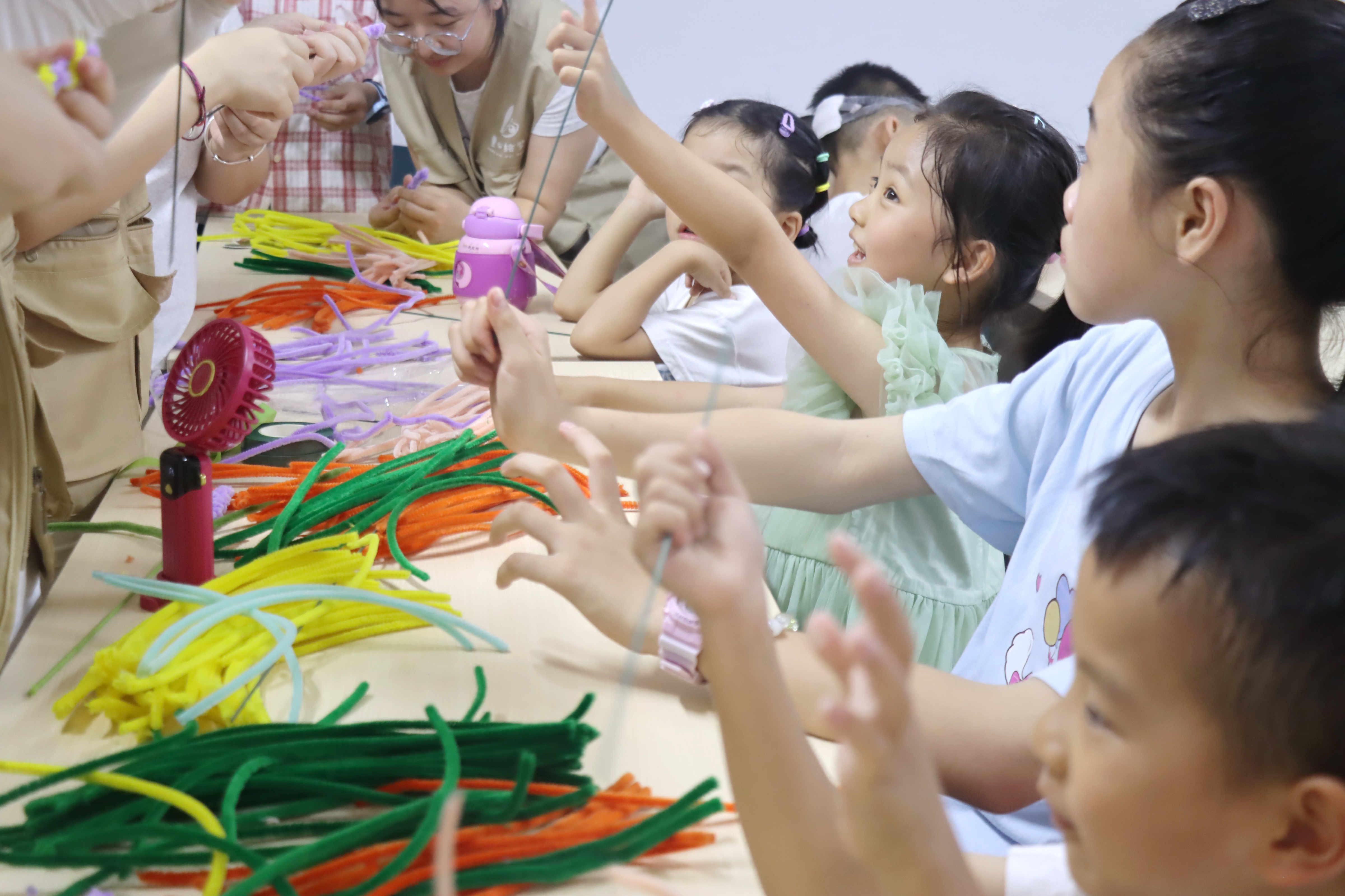 随后的扭扭棒更是创意纷飞。小朋友们可以在志愿者的指导下,将扭扭棒弯折、缠绕,做出郁金香的优雅花瓣、向日葵的灿烂花盘,让经典花朵造型在手中重生;也可以大胆自由创作,把扭扭棒拧成奇趣小怪兽、梦幻小秋千,让扭扭棒绽放独特创意火花。创作过程中,志愿者们耐心指导,手把手教小朋友们如何塑形、搭配颜色。小朋友们积极参与,发挥自己独特的想象力,提出各种新奇的创意,现场气氛热烈而温馨。