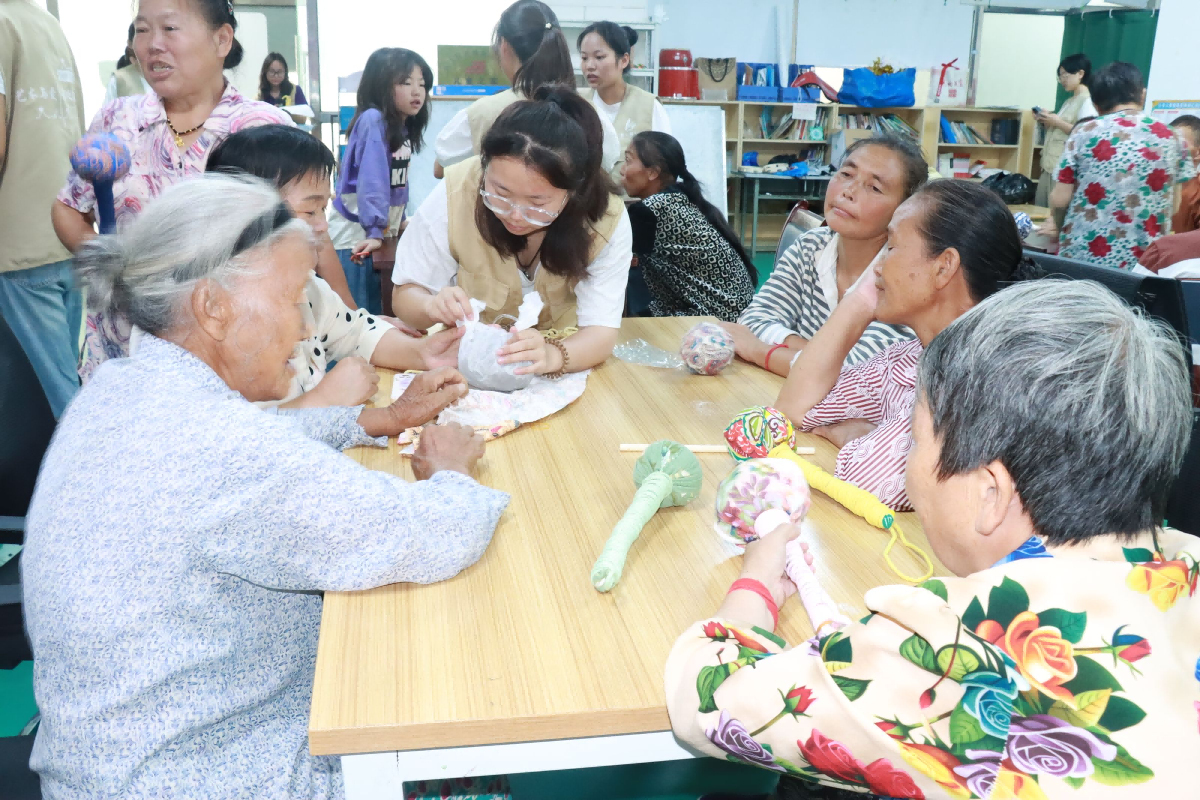 活动伊始,志愿者向大家介绍艾草锤的养生功效与制作步骤。随后,大家分工协作,分发提前准备好材料、填充艾草、缠绕彩绳等。大家凭借丰富生活经验耐心填充艾草,志愿者则细心辅助、创意点缀。制作间隙,有些老人分享往昔岁月里的手工故事,志愿者倾听之余,也交流校园趣事,代际互动在艾草香气与欢声笑语中升温。完成后,大家手持散发淡淡艾香、色彩缤纷的艾草锤,脸上满是喜悦。老年人、残疾人不仅在志愿者的带领下一起用艾草锤敲打八虚,还结伴在社区拍照,定格这份美好。