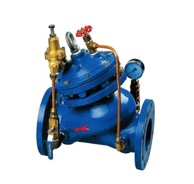 当管道从进水端给水时,水流过针阀进入主阀控制室,出口压力通过导管作用到导阀上,当出口压力高于导阀设定值时,导阀关闭,控制室停止排水,此时主阀控制室内压力升高并关闭主阀,出口压力不再升高。